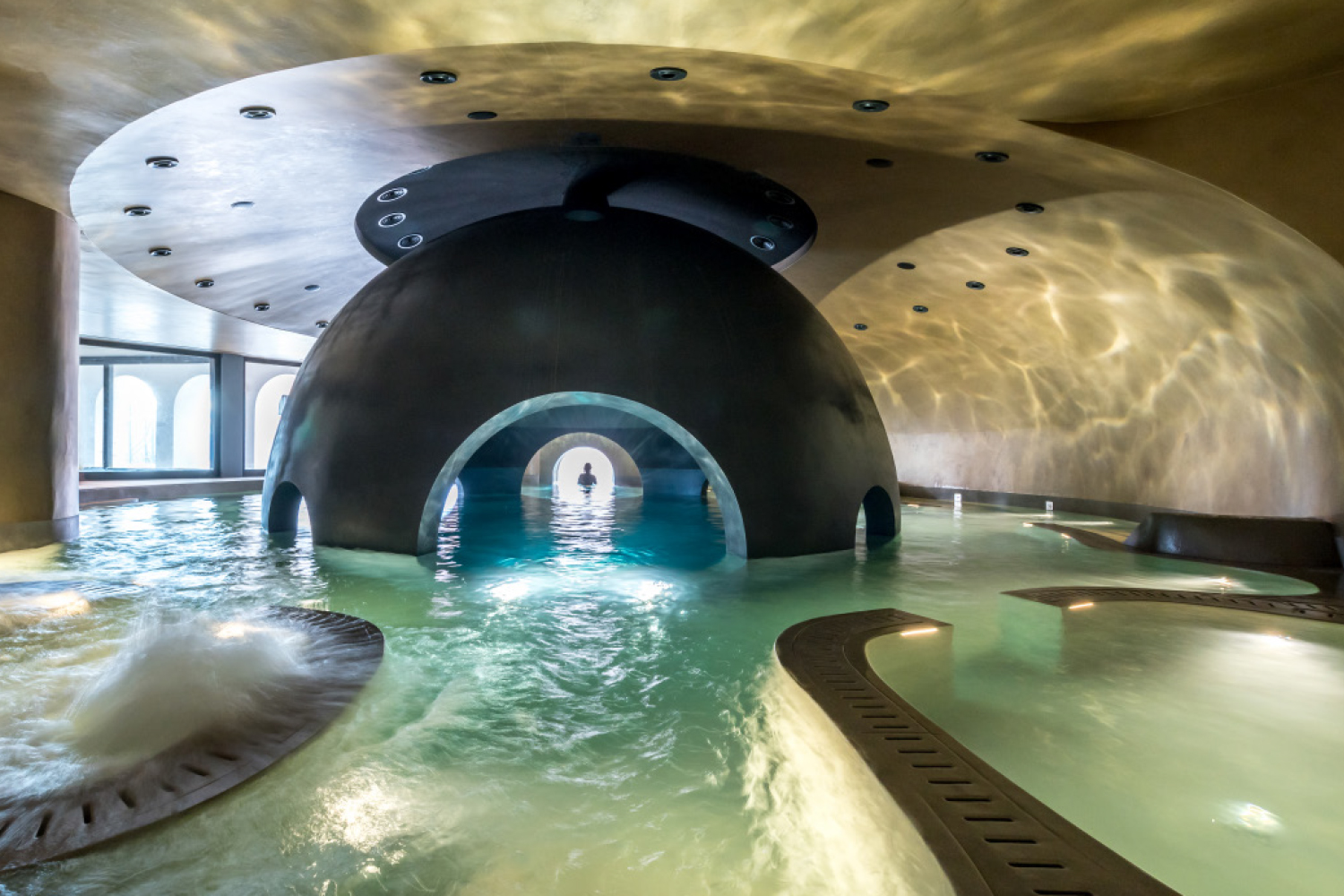 Le spa au design innovant est un sanctuaire immersif et expérientiel. Une « tour de Babel » circulaire blanche et lumineuse, encastrée d’alvéoles, s’élève sur quatre niveaux et s’étend sur 3 500m² : parcours aquatique de 25 m, escalier en spirale, piscine sphérique sous des arches de pierre, bassin watsu, tepidarium, hammam byzantin, sauna infrarouge et sauna finlandais. Des activités et des ateliers sont proposés quotidiennement : yoga, fitness, TRX, pilates, qigong, méditation, conférences, marche dans la forêt avoisinante… Les soins et traitements proposés sont complets, le menu riche et foisonnant. Les thérapeutes sont d’un professionnalisme hors pair et maîtrisent parfaitement leur art, chacun dans sa spécialité. Le suivi quotidien est ultra-personnalisé.