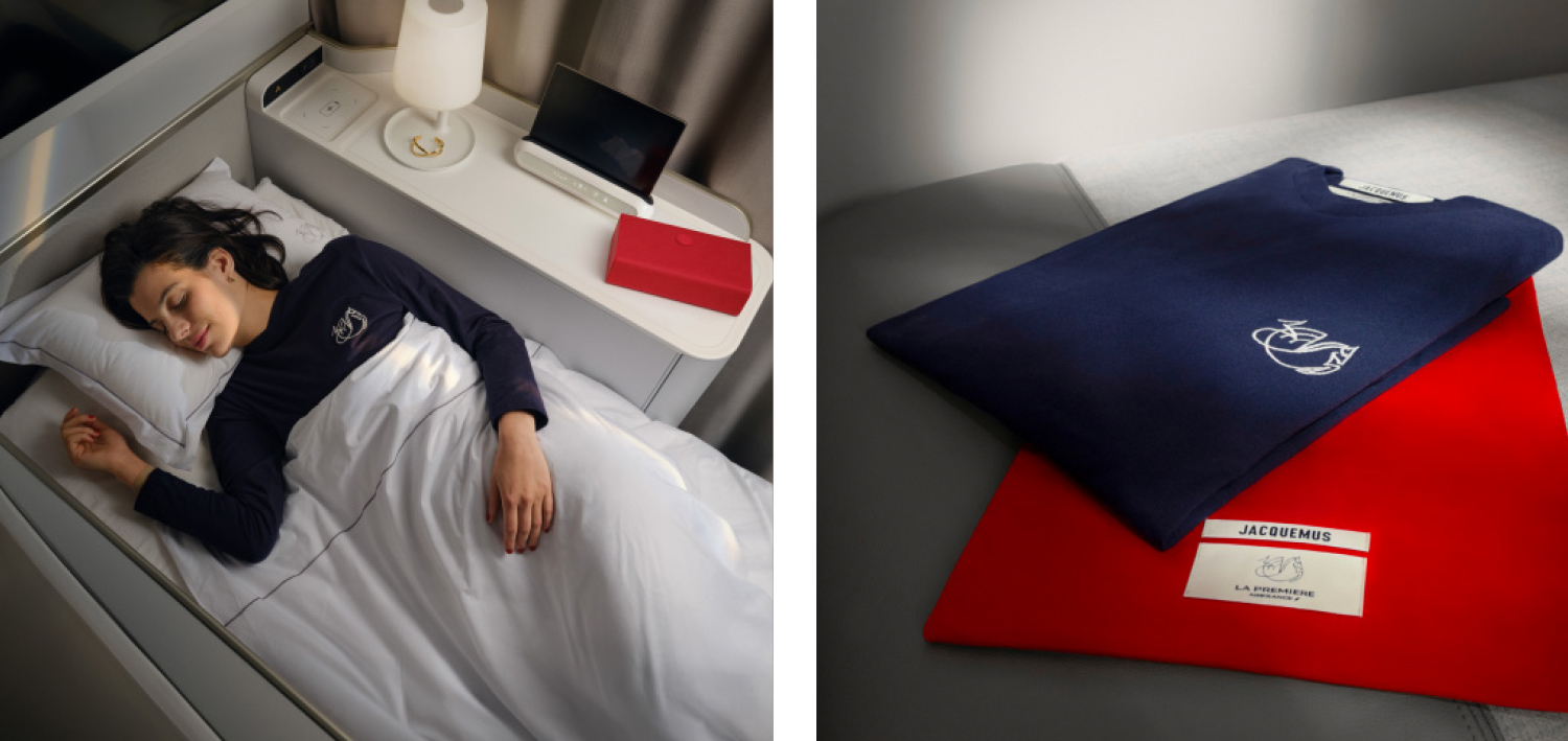 Depuis le 18 mars 2025, les hôtes La Première se voient offrir « Le Pyjama », un modèle alliant confort et élégance, créé par le Français Simon Porte Jacquemus. On retrouve les codes chers à Maison Jacquemus et Air France dans cette tenue en coton bleu marine, avec son petit hippocampe ailé (symbole historique de la compagnie nationale) et un discret label « Le Pyjama ». Disponible en quatre tailles, le haut du pyjama se décline en deux versions, avec col en V et coupe ajustée ou avec col rond et coupe régulière. À choisir en rouge ou en bleu, l’ensemble est glissé dans une housse en popeline de coton en forme de taie d’oreiller.