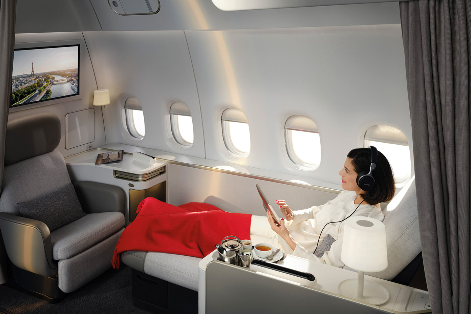 La nouvelle suite La Première étoffe son offre. S’étirant dorénavant sur cinq hublots, entièrement modulable, elle se compose d’un nouveau siège (adaptable lors du décollage et de l’atterrissage), et d’une méridienne convertible en lit d’une longueur de deux mètres. Chaque suite bénéficie d’un rideau en maille offrant une isolation complète , garantissant au passager une ambiance feutrée et « cosy ». Le voyageur dispose également de deux écrans anti-reflets 4K de 32 pouces, d’un casque à réduction de bruit, avec la possibilité d’appairer son propre casque ou ses écouteurs aux écrans en Bluetooth.